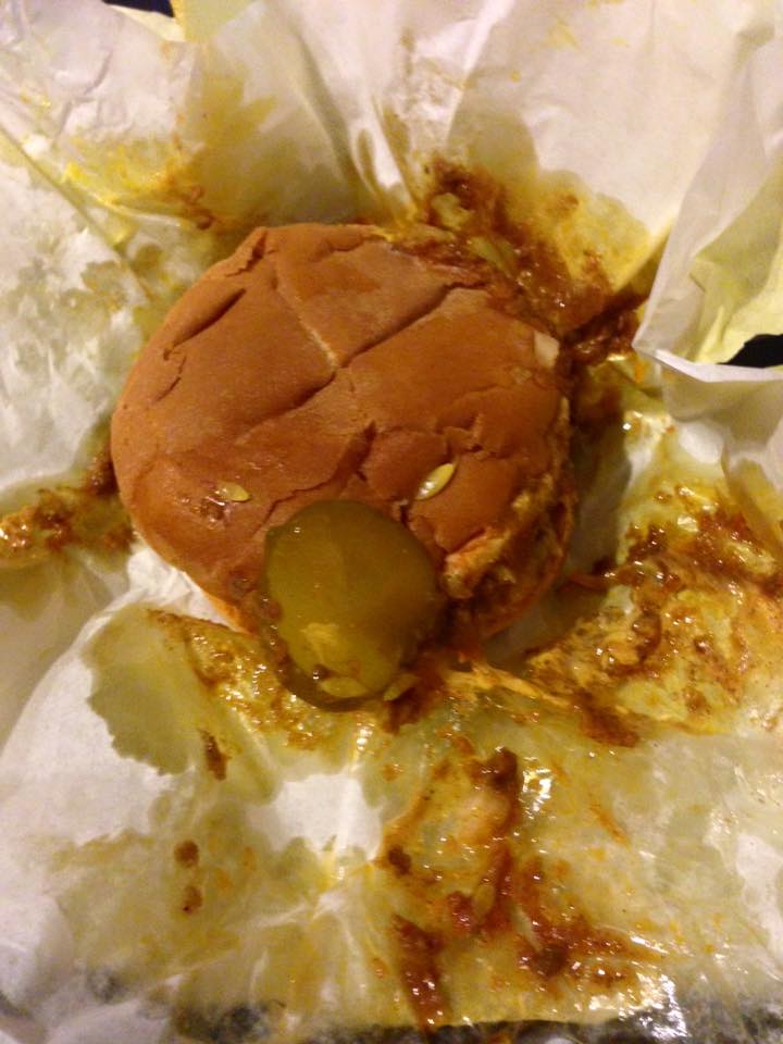 ソースはべちゃべちゃに見えるけど、とても美味しいんです☆ピクルスは4枚も入っていたけどw 顎がハズレそうな大きさ。