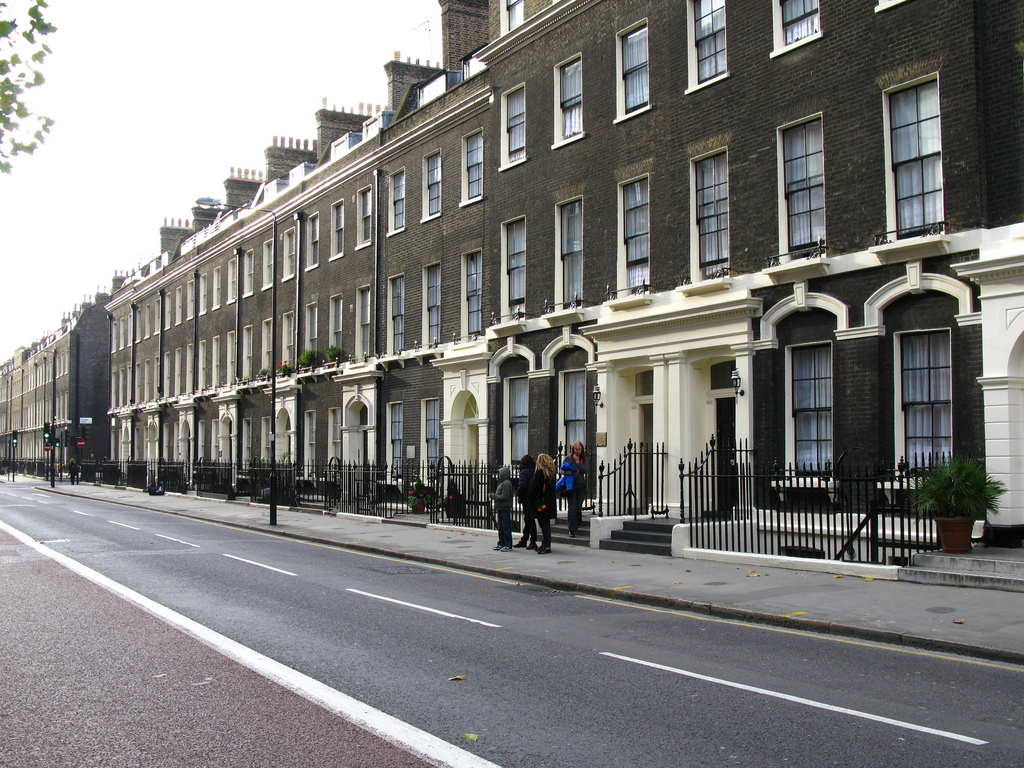 大英美術館から徒歩5~6分、ロンドン大学などの大学街もすぐそばにあるアカデミックな土地柄にある1本の通りがゴウアーストリートです。建物は長屋のように横一列に繋がっており、窓が2つほどあり、ステップと玄関ドアがあってとまるでアパートのようですが、中は一軒家のようになっており、階段があって2階建3階建となっています。外の壁だけが繋がっている一軒家という感じです。