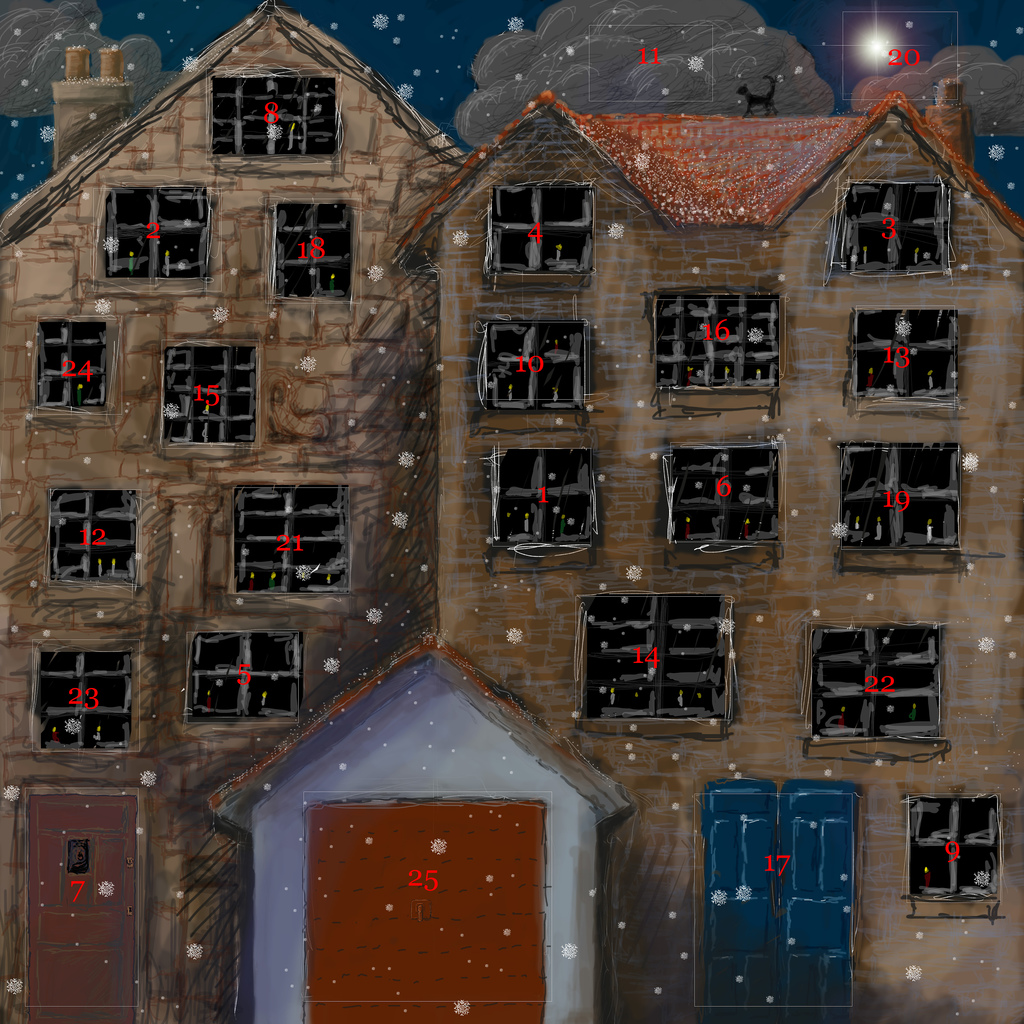 クリスマスへのカウントダウンをするためのカレンダーで、1日ごとに窓やポケットがついています。その日の窓やポケットを開けるとチョコレートやお菓子、イラストが入っています。