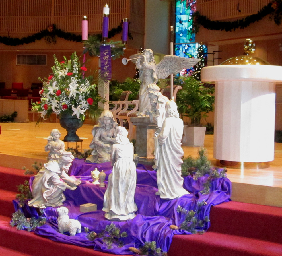 アドベント期間の礼拝の祭服や祭壇布には「悔い改め」を意味する色である紫を用いる習慣が、カトリックやルター派に残っています。ただし、アドベント第三主日(3週目の日曜日)のミサではバラ色を用います。