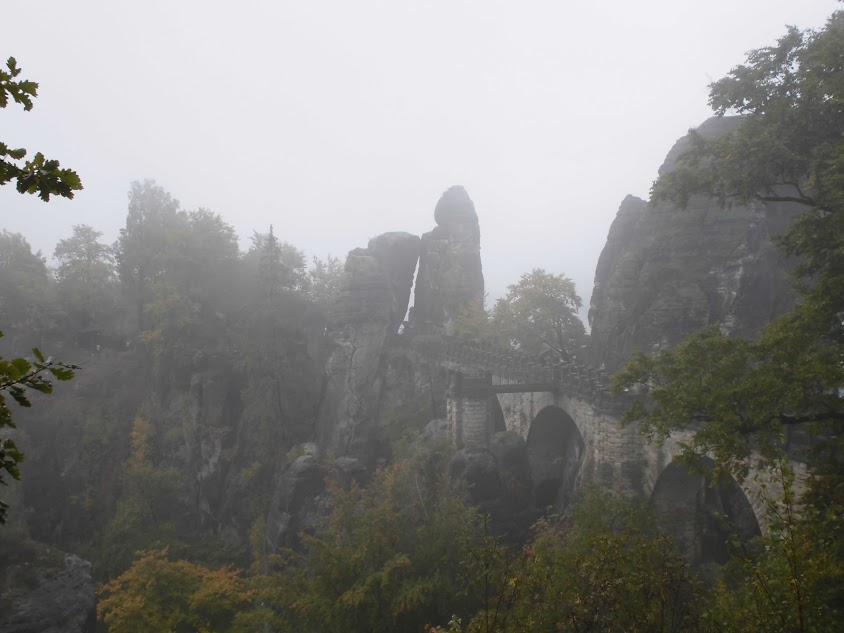 そしてさらに5分程坂を下りながら進むと、有名なバスタイブリッジが見えてくる。肉眼では橋は結構見えていたのだが、写真ではかなり霧がってしまっていた。(晴れていたらという画像は検索サイトで「Bastei Brucke」と出てくる。