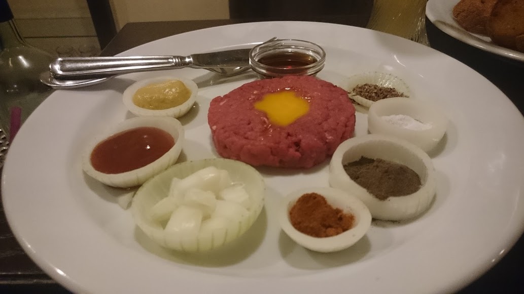 着席後配られたメニューは、英語版もあった。(さすがに日本語はない。)今回は牛肉タルタル仕立て(生肉と玉ねぎや卵などを混ぜてパンにのせる)を前菜でシェア(199コルナ(約1000円)した。