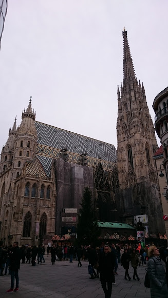にぎやかな通りを進むと、ものすごく目立つ大聖堂の塔が見える。これが「Stephansdom(シュテファン寺院)」だ。教会の塔としては世界で三番目の107メートルあるんだそう。この寺院は、なんとあのモーツァルトの結婚式や葬儀が行われた場所なんだそう。