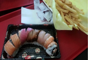 安いお寿司屋さんは持ち帰りが基本で弁当箱のようなものに入れてくれる。ポテト(フレンチフライ)がついてきたので爆笑してしまった。この意味不明な組み合わせがアメリカンw