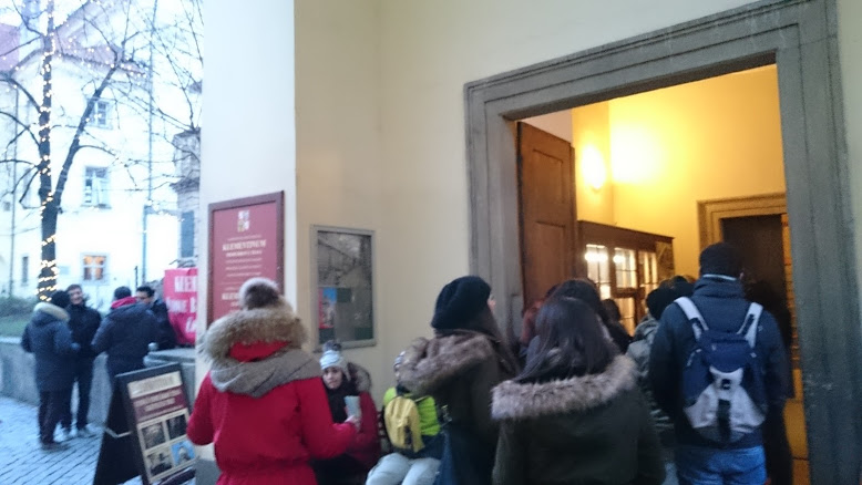 事前に元日でも朝10時から夕方5時くらいまではガイドツアーが30分おきに行われていることを調べていたため、ゆったりと家を出て午後4時のツアーに参加するつもりで午後3時45分頃最寄の地下鉄A線「Staromestska駅」に到着し、そこから徒歩3分ほど標識に従って歩き敷地内へ。どこでガイドツアーが行えるのか謎だったが、なにやら行列が見えた。