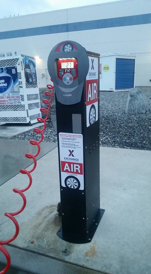 これは空気を入れるためのマシンで、ガソリンスタンドの横に小さく設置されていることが多く、1ドルだったり、2ドルだったりと有料です。有料で、コイン式マシンになっていて自分で空気を入れるシステムです。数字が27と出ているのが空気圧の数字です。